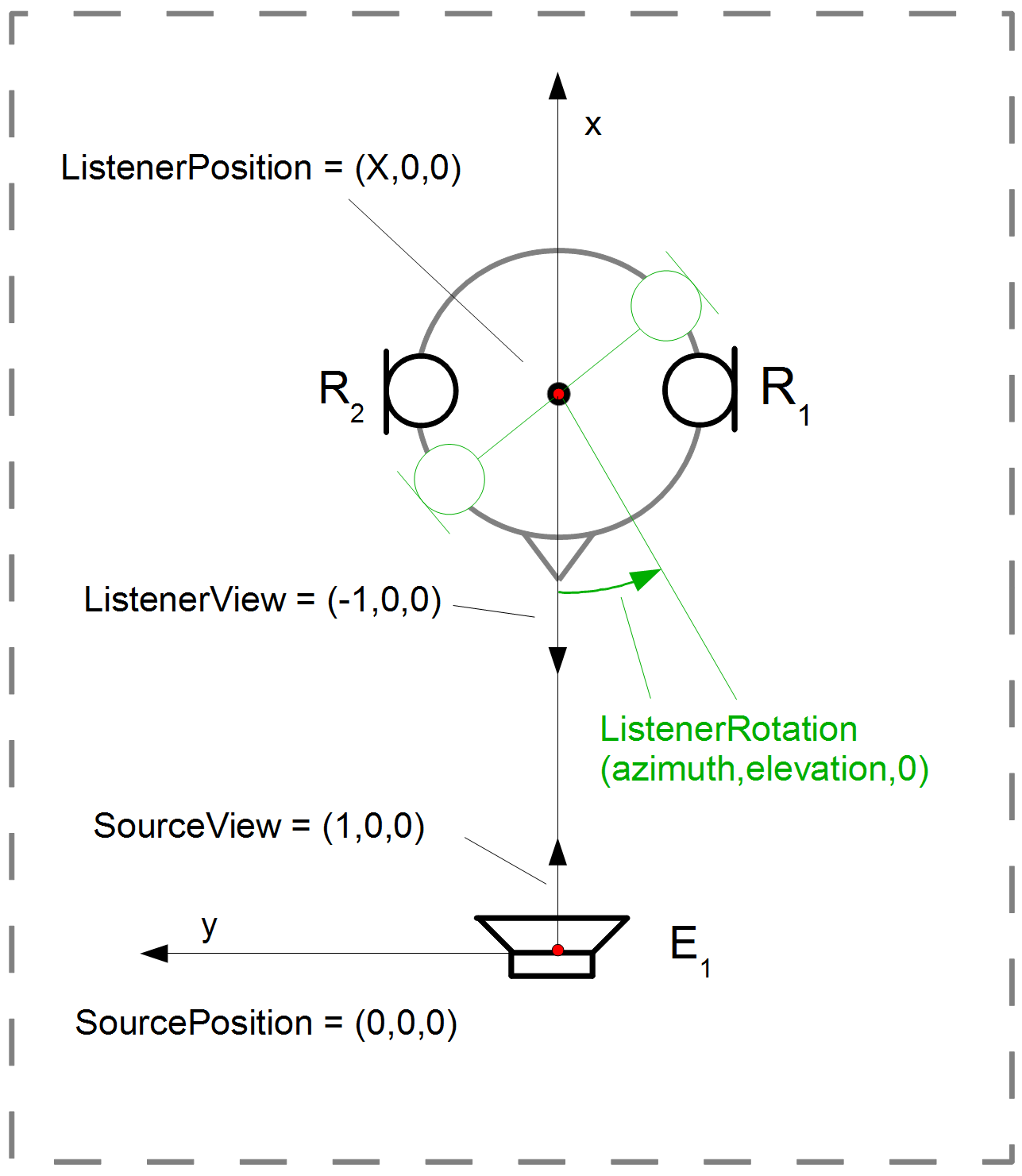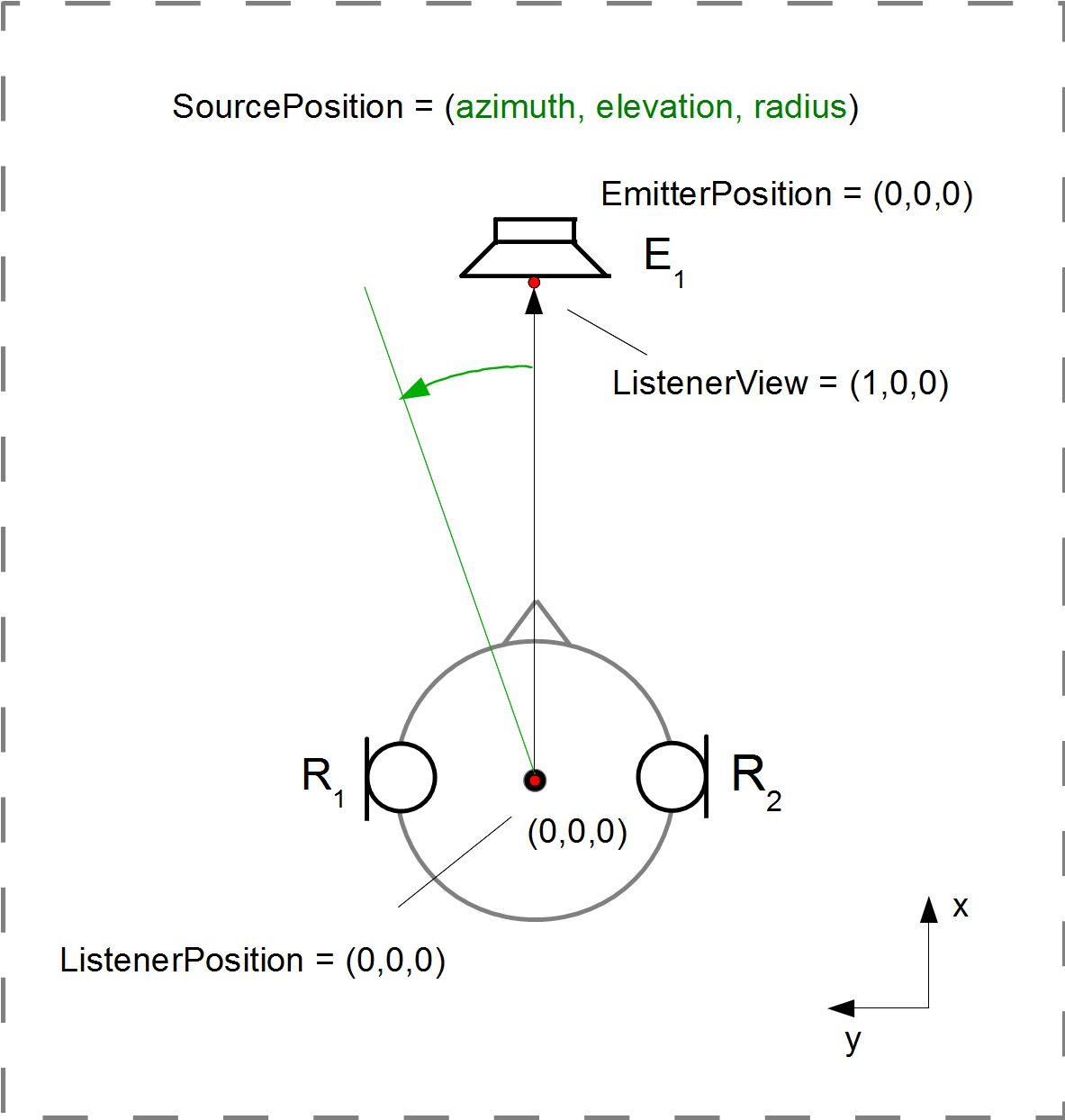 - Listener: The listener is in the origin of the setup, facing in the direction of the y-axis. Thus, for default values, ListenerPosition=[0 0 0], ListenerView=[1 0 0], ListenerUp=[0 0 1], all given in cartesian coordinates.
